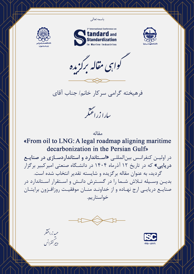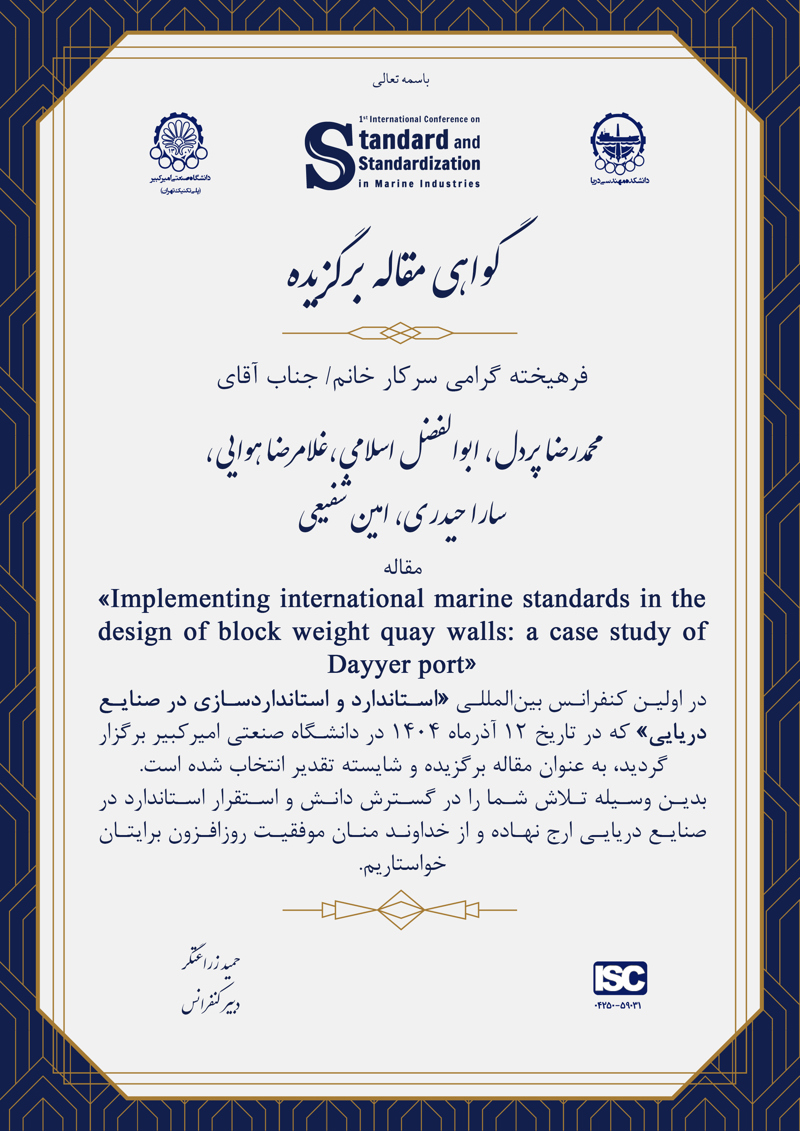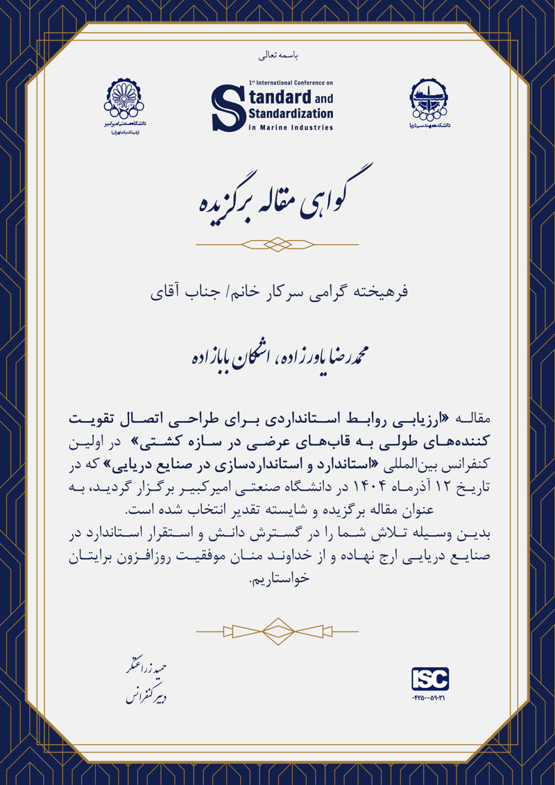 در اختتامیه اولین کنفرانس بینالمللی استاندارد و استانداردسازی در صنایع دریایی، از نویسندگان مقالات برتر که بر اساس ارزیابی داوران و هیئتعلمی کنفرانس بالاترین امتیاز را کسب کردهاند، تقدیر به عمل آمد.بهپاس تلاشهای علمی و پژوهشی این عزیزان، لوح تقدیر ویژهای به آنان اهدا شد.